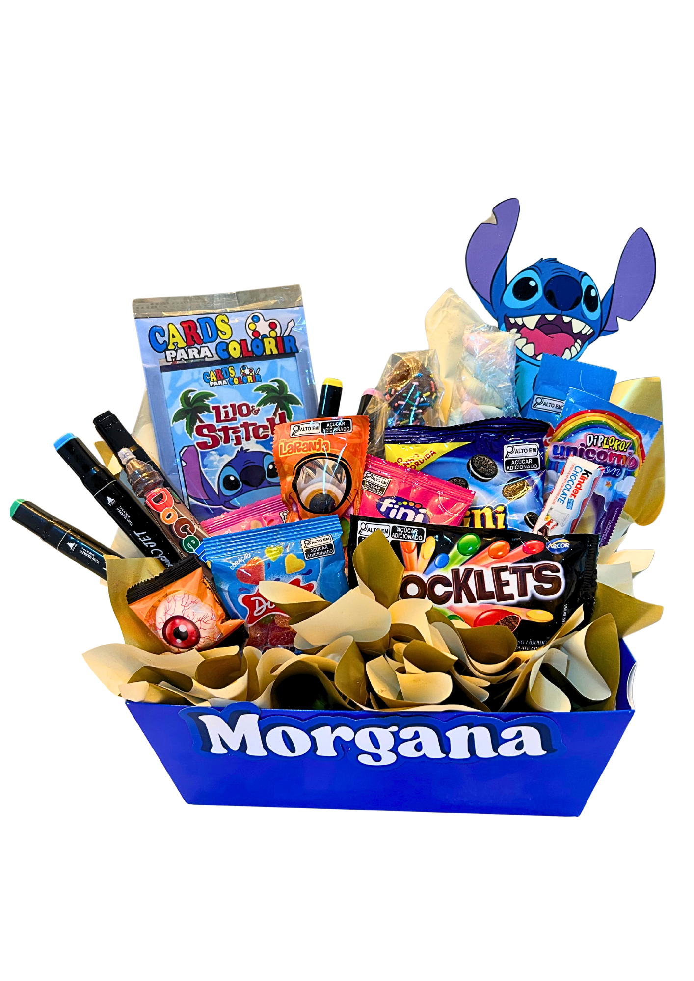 Cesta do Stich com nome personalizado contendo:
